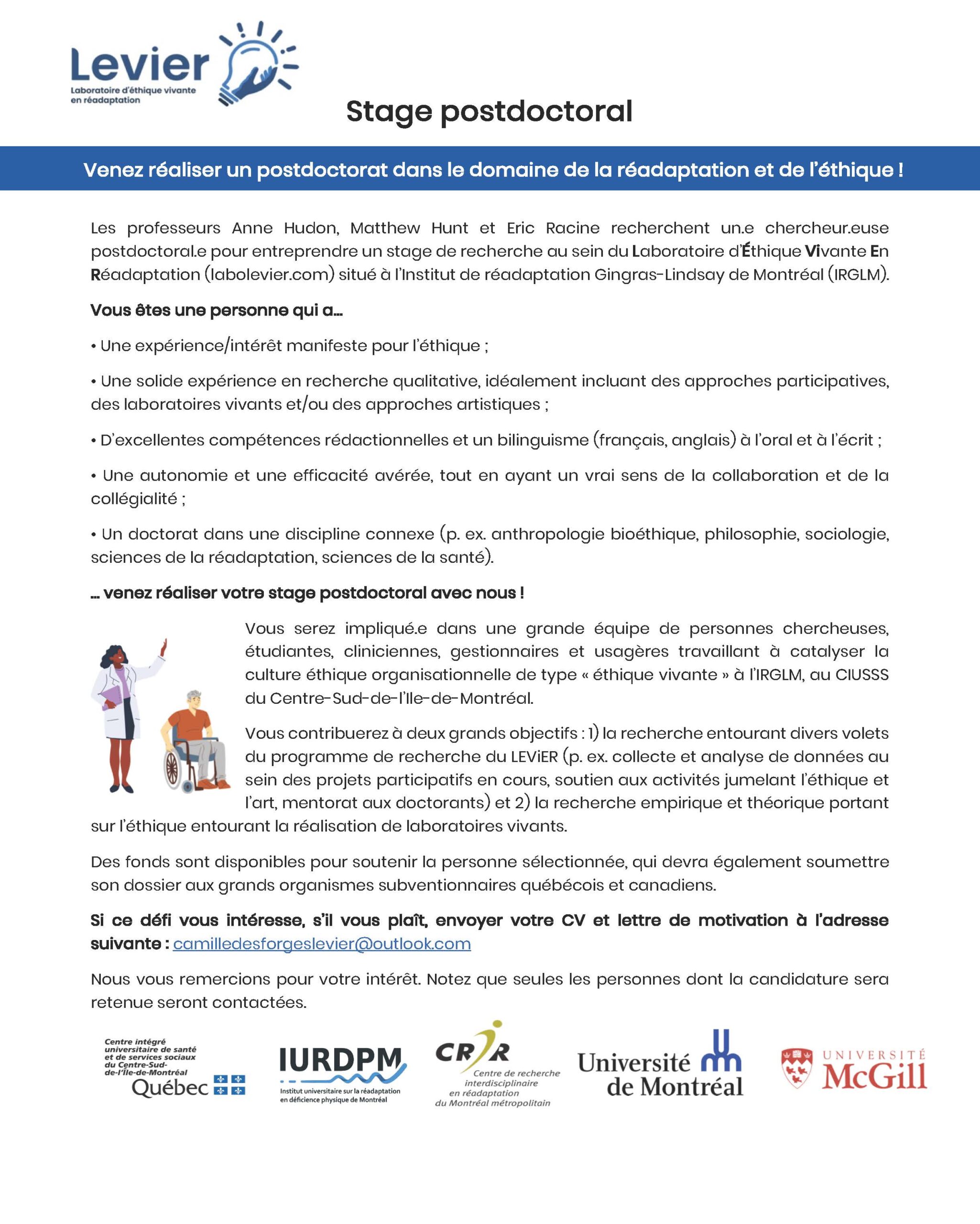 Les professeurs Anne Hudon, Matthew Hunt et Eric Racine recherchent un.e chercheur.euse postdoctoral.e pour entreprendre un stage de recherche au sein du Laboratoire d’Éthique Vivante En Réadaptation (labolevier.com) situé à l’Institut de réadaptation Gingras-Lindsay de Montréal (IRGLM).