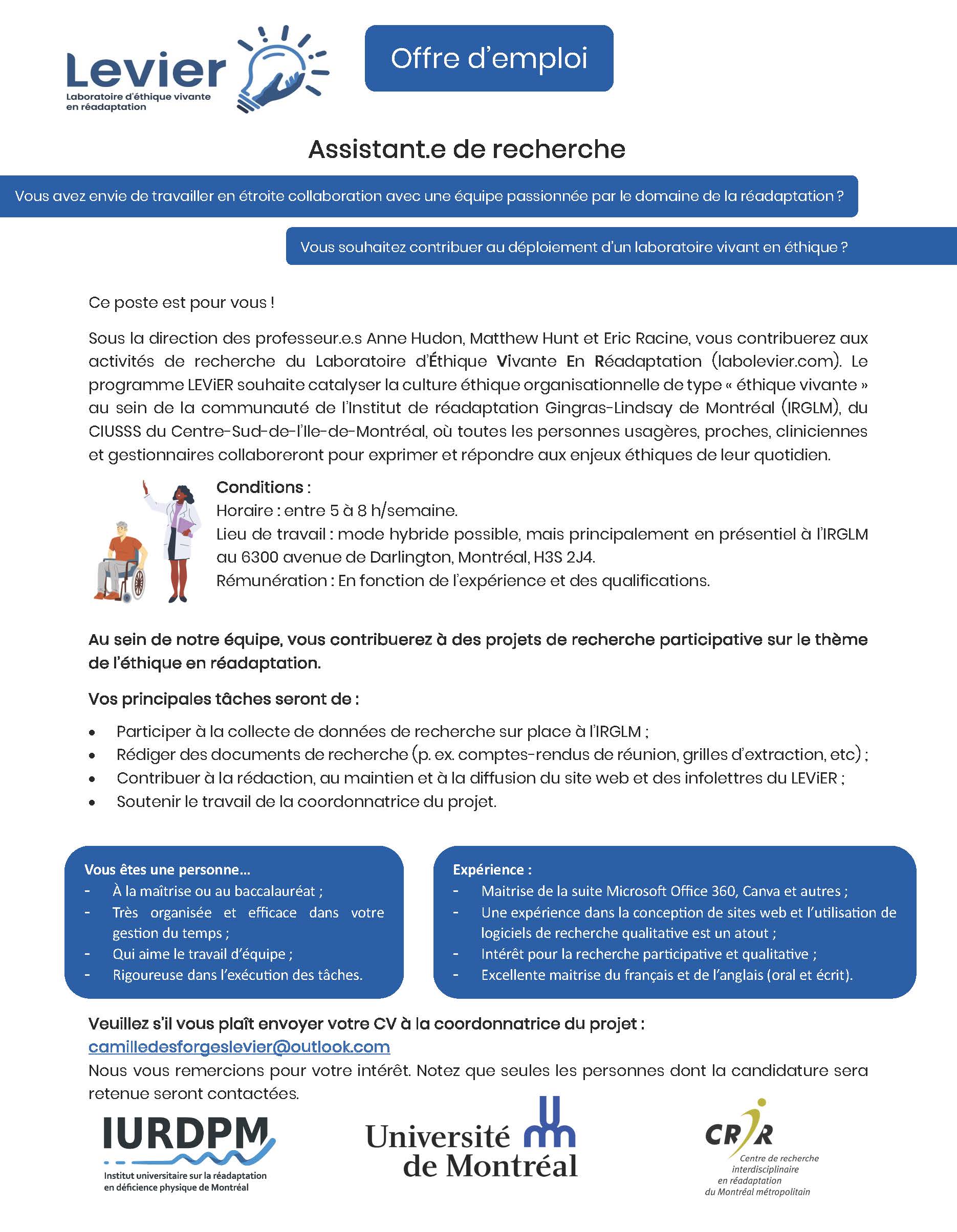 Offre d’emploi – Assistante ou assistant de recherche : LEVIER – Laboratoire d’éthique vivante en réadaptation